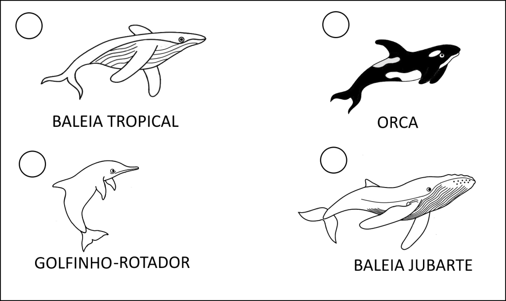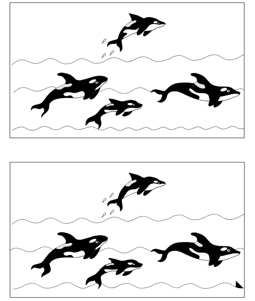 No desenho abaixo, marque com um X as orcas fêmeas da primeira figura e depois encontre as 7 diferenças entre os dois quadros.