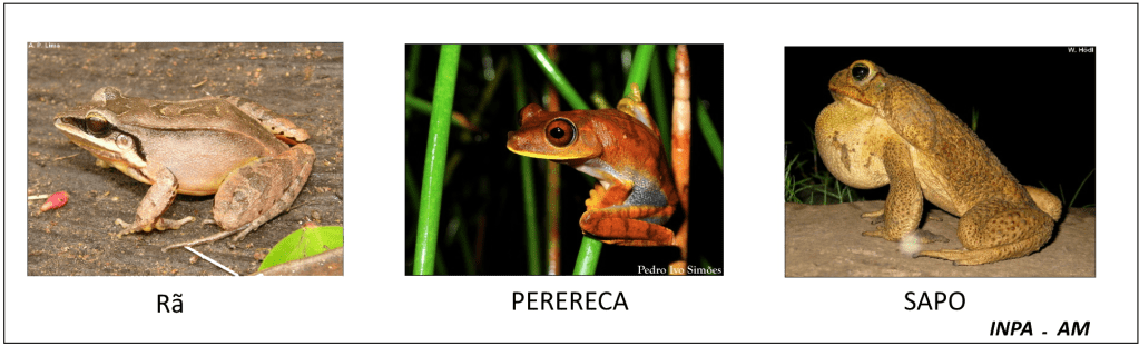 A Floresta Amazônica abriga a maior diversidade de animais em todo o planeta. O Instituto Nacional de Pesquisa da Amazônia – INPA estuda os recursos naturais da floresta e seus habitantes e está sempre descobrindo novas espécies, especialmente de rãs, pererecas e sapos que gostam de água e umidade para seu ciclo de vida. Em sua “Sapoteca” o INPA reúne muitas informações, vídeos, fotos e até gravações das cantorias desses bichinhos. Veja em: https://ppbio.inpa.gov.br/sapoteca