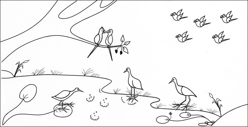 ∙ Quantas aves pernaltas estão procurando peixinhos?