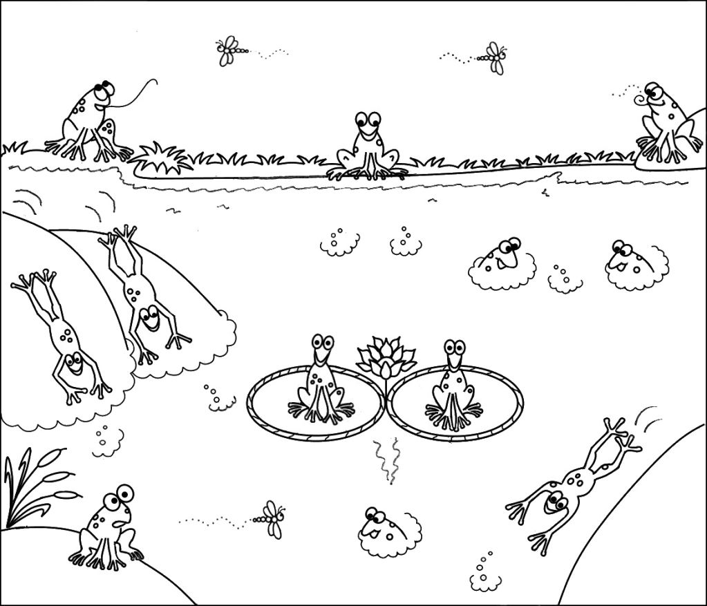 Divida a figura em três partes, de tal forma que cada parte tenha um grupo de 4 rãs, cada uma fazendo algo diferente: saltando, mergulhando, caçando insetos ou simplesmente olhando as companheiras.