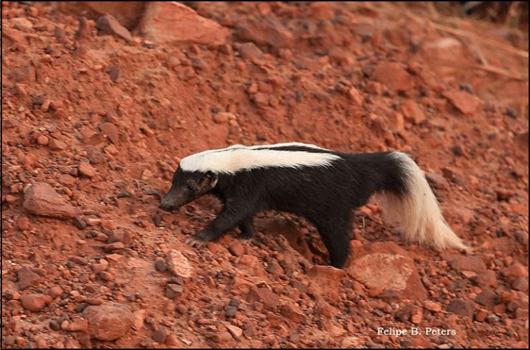 Mais conhecido como gambá americano o cangambá é um bicho fedorento, do tamanho de um gato, preto e com listras brancas do alto da cabeça até o rabo comprido e peludo.