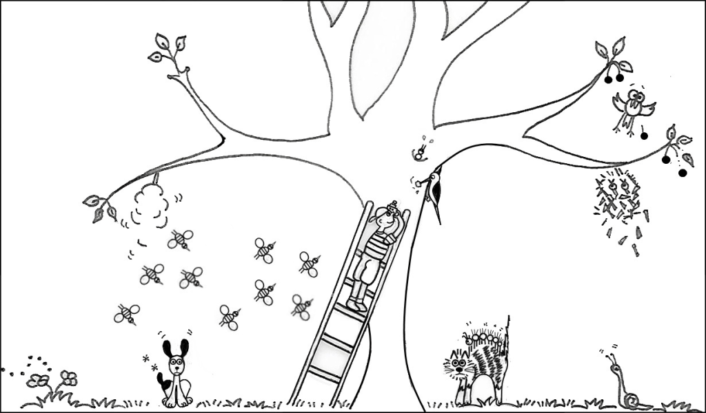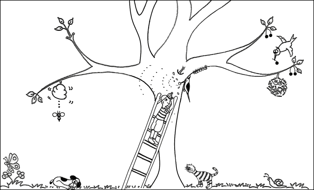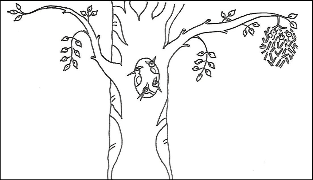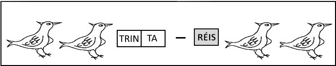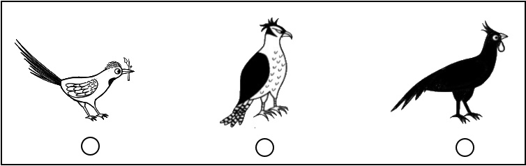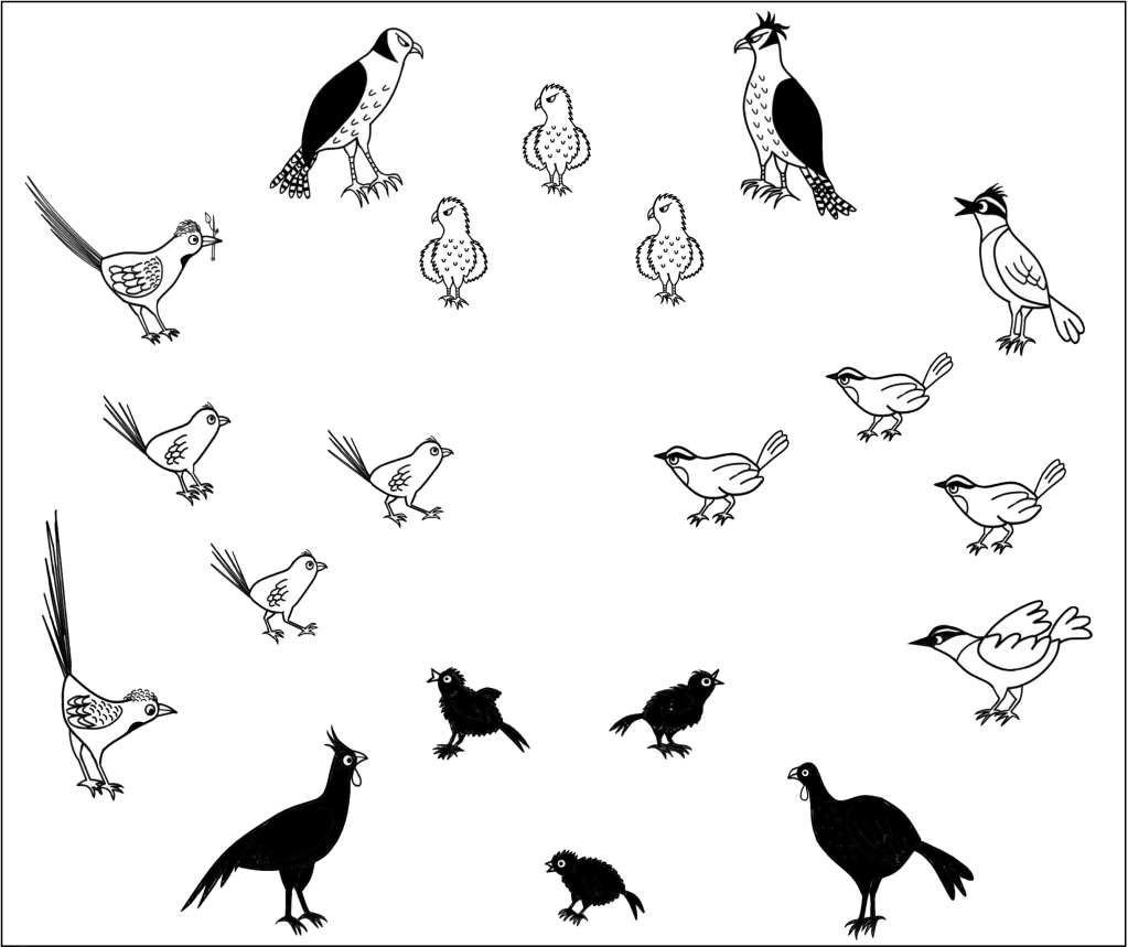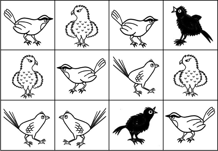 Usando apenas duas linhas retas, forme quatro triângulos dentro do quadro, de tal forma que, em cada um deles, fique uma só família de pássaros.