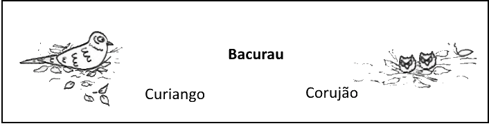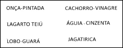 1∙ JACUPEMBA – Ave corpulenta, parente das galinhas, vive em florestas, matas e beira de lagoas e rios. Tem asas e cauda compridas, bico curto e pés fortes para ciscar o chão. As penas são escuras mas com manchas brancas no peito e bordas cor de ferrugem nas asas. No pescoço tem uma pele dependurada bem vermelha, chamada barbela. Os olhos também são vermelhos. Gosta de ficar no alto das árvores onde faz ninhos com cipós. Quando um casal é formado, passa a ficar sempre junto e a cada ninhada tem 3 filhotes. Alimenta–se principalmente de frutas e ajuda a manutenção das florestas espalhando as sementes.